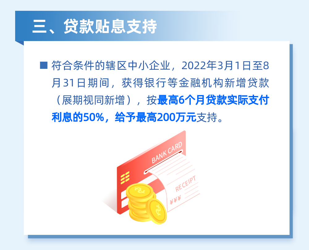 降低企业贷款成本。对2022年3月1日至5月31日期间,获得辖区银行等金融机构新增贷款(展期视同新增)的规模以上(或限额以上)企业(房地产及金融企业除外),按最高3个月贷款实际支付利息的50%予以支持,单家企业最高200万元。(牵头单位:区金融工作局)