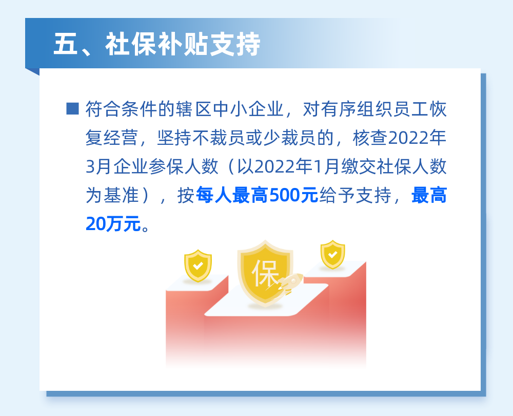 鼓励企业稳岗留工。对区四类百强企业坚持不裁员或少裁员的(2022年3-5月平均缴交失业保险人数不低于2022年1月的95%),按2022年3月实际缴纳失业保险人数给予500元/人的补贴,单家企业最高20万元。(牵头单位:区人力资源局)