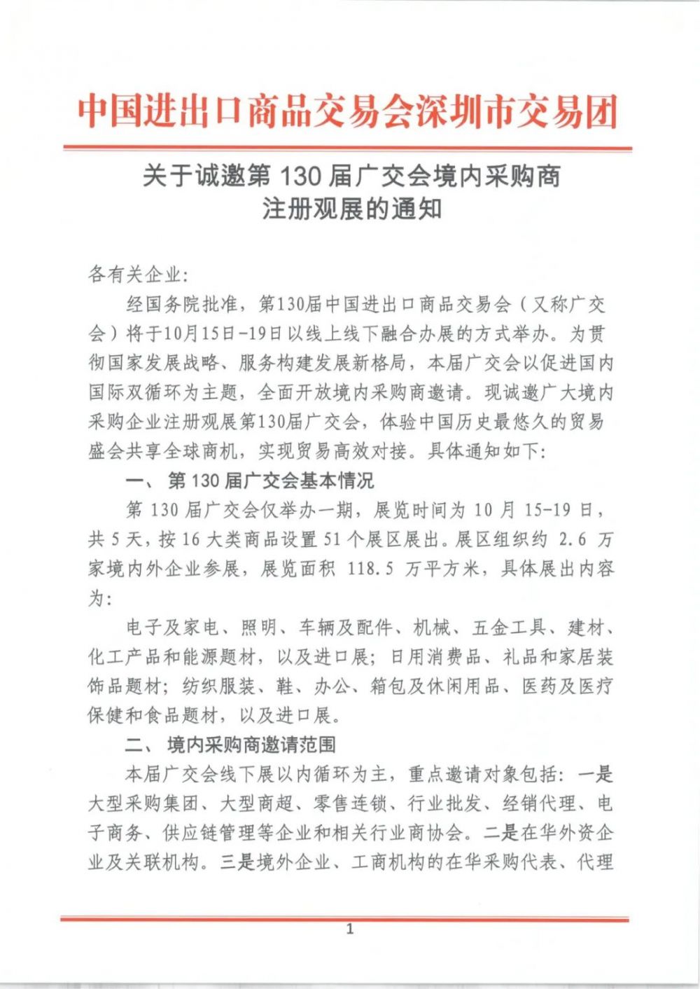 第130届中国进出口商品交易会(简称:广交会)将于10月15日-19日以线上线下融合办展的方式举办。为体现中国历史最悠久的贸易展会,实现贸易高效对接,商会受广交会深圳交易团的委托,协助邀请会员企业注册登记成为本届展会境内采购商,本届境内采购商办证、寄证的费用均全免,现将《通知》及《办证指引》转发于您。